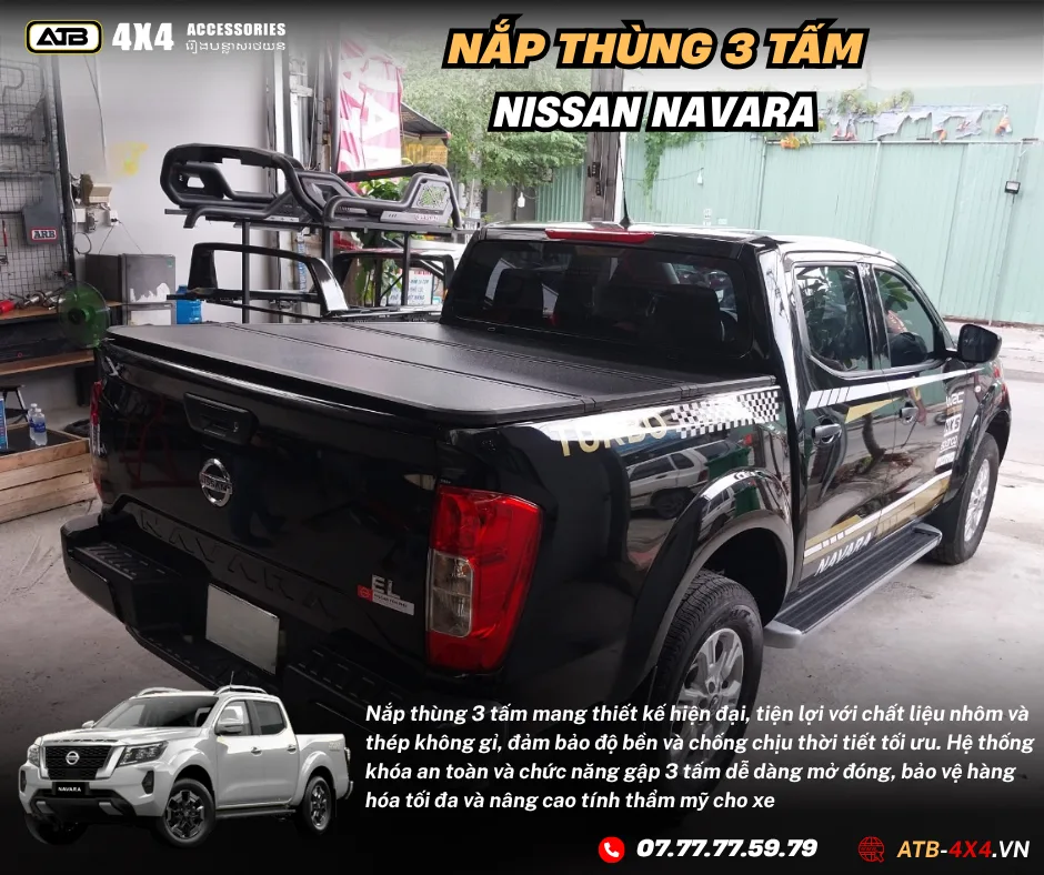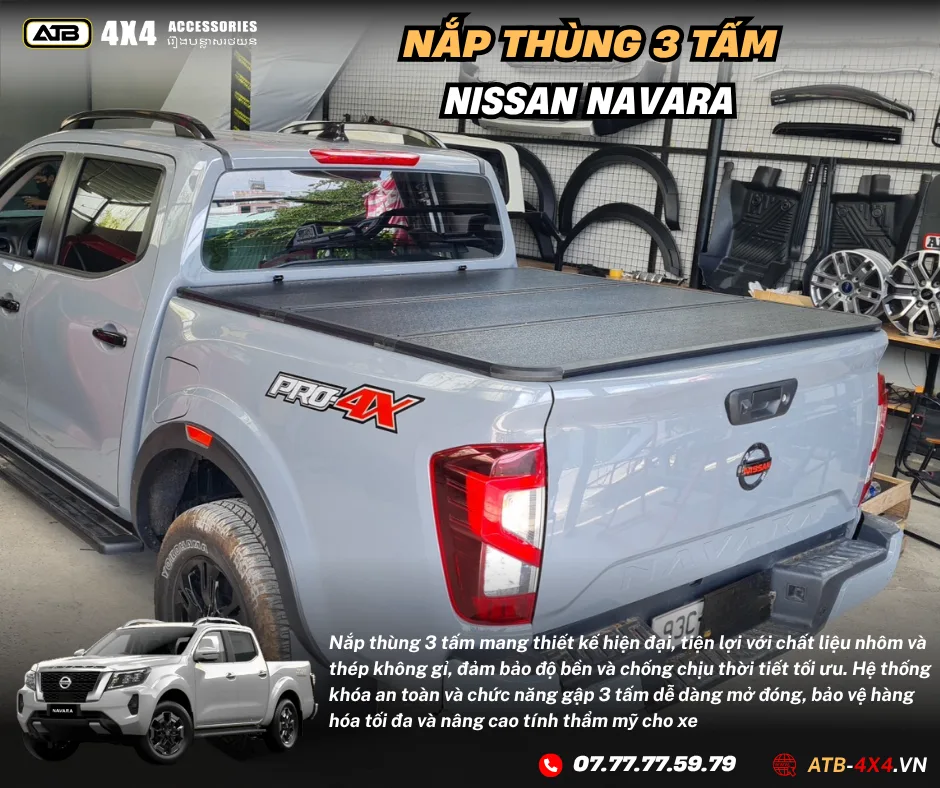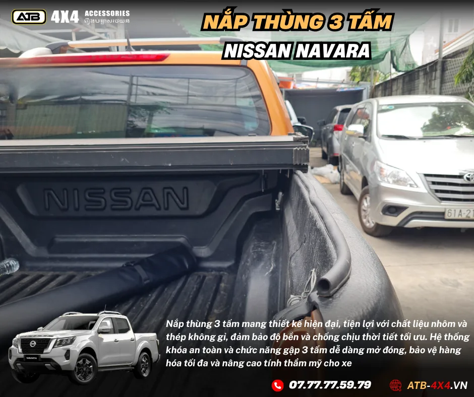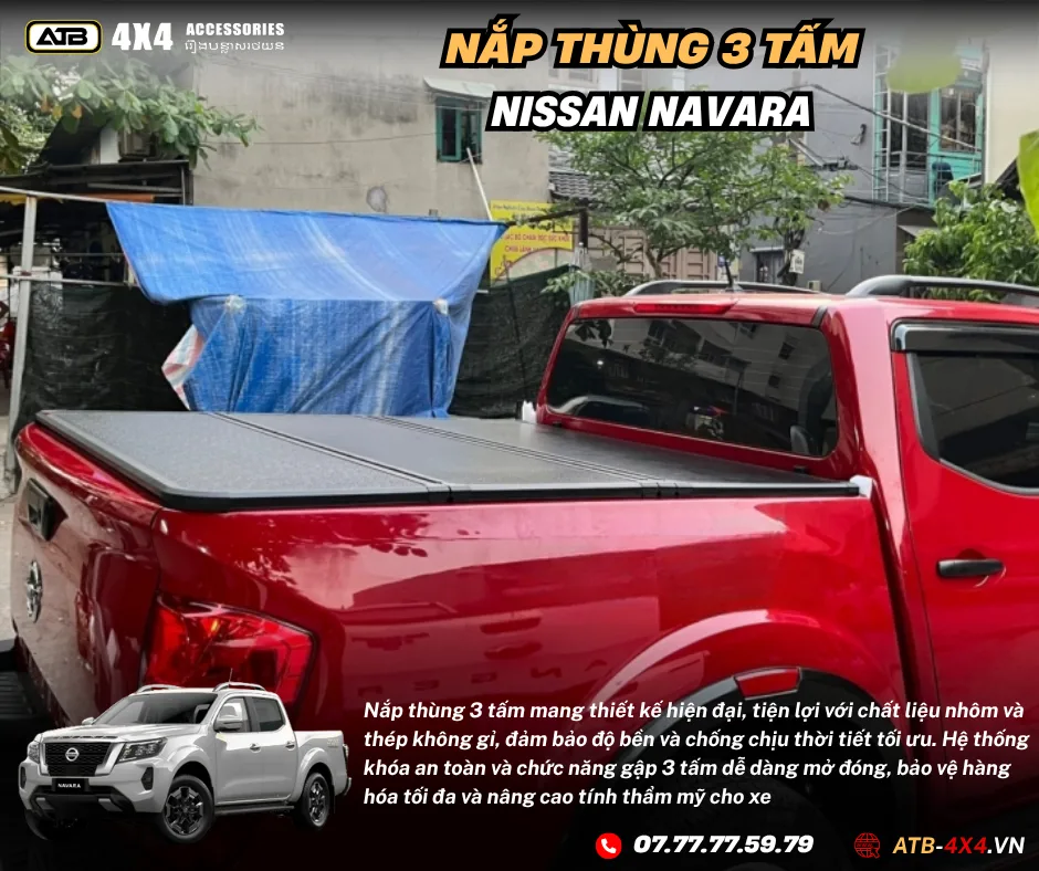 Nắp thùng 3 tấm xe bán tải là một loại nắp được sử dụng trên thùng của xe bán tải. Điều đặc biệt về nắp này là nó được tạo thành từ 3 tấm bản lề: một mặt đứng phía trước, một mặt đứng phía sau và một mặt nắp đậy ở trên, có thể mở lên và gập lại một cách linh hoạt. Nhờ vào cơ chế này, người sử dụng có thể dễ dàng truy cập vào phần trong của thùng xe mà không cần phải mở toàn bộ nắp. Việc đóng mở nắp thùng 3 tấm thường được thực hiện thông qua việc lật hoặc trải các tấm nắp này ra.